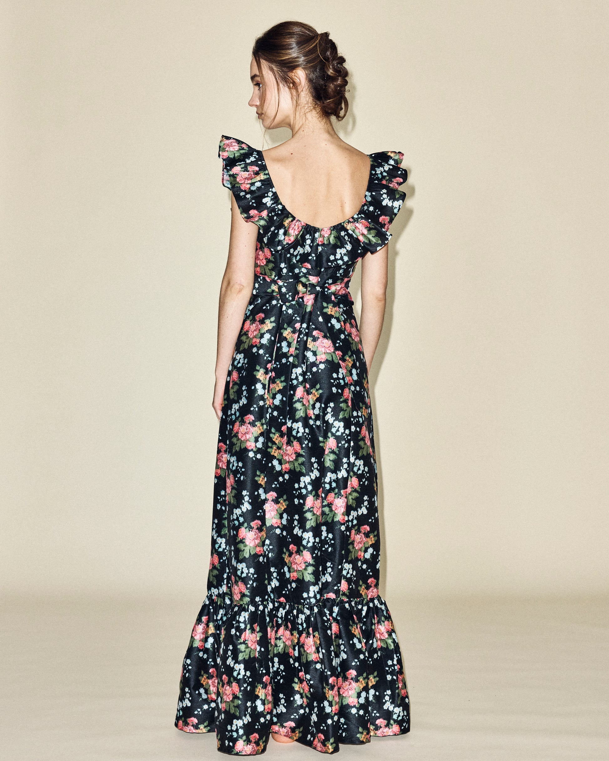 Make an entrance. The Camille Dress sits at the natural waist with a bow tie back, has an elastic ruffle neckline that can be worn on or off the shoulders, an invisible side zip and flowy ruffle hem.